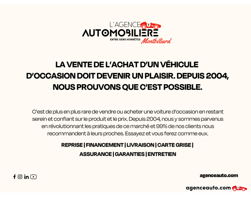 Votre Agence Automobilière propose des Garanties Commerciales de 3 à 60 mois* (voir conditions en agence et sur le site). La garantie légale de conformité ne s’applique pas dans une vente entre particuliers. Détail des conditions générales de souscription délivré en Agence ET préalablement à la conclusion de la vente. Nous sommes agréés SIV et pouvons réaliser votre carte grise directement à l'agence.