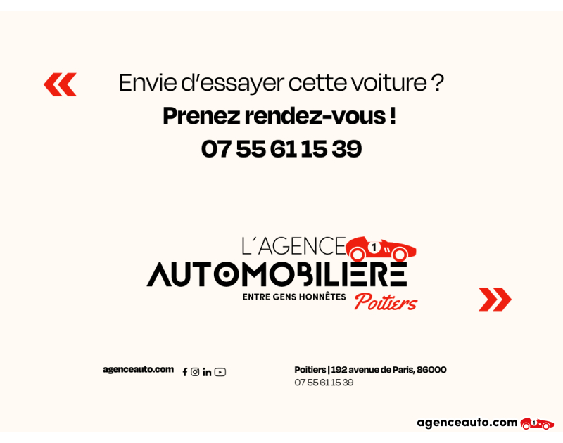 Su Agencia Automotriz ofrece Garantías Comerciales de 3 a 60 meses* (ver condiciones en la agencia y en el sitio web). La garantía de conformidad legal no se aplica a las ventas entre particulares. Los detalles de las condiciones generales de suscripción se proporcionan en la agencia y antes de la conclusión de la venta. Estamos aprobados por el SIV y podemos emitir directamente su certificado de registro de vehículo en la agencia.